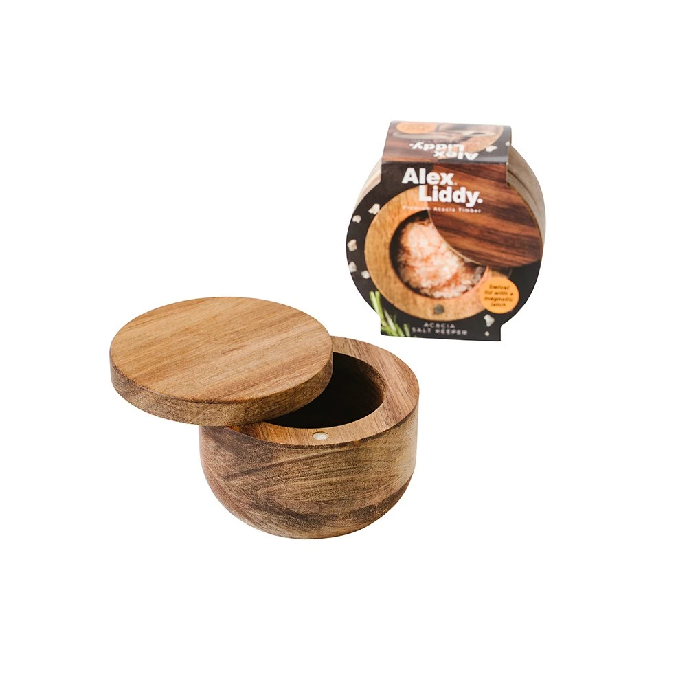 Keep your cooking essentials close at hand with the Alex Liddy Acacia Salt Keeper.