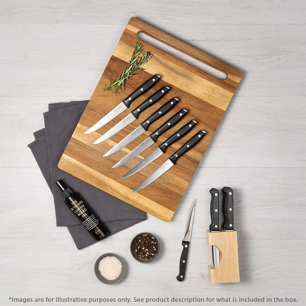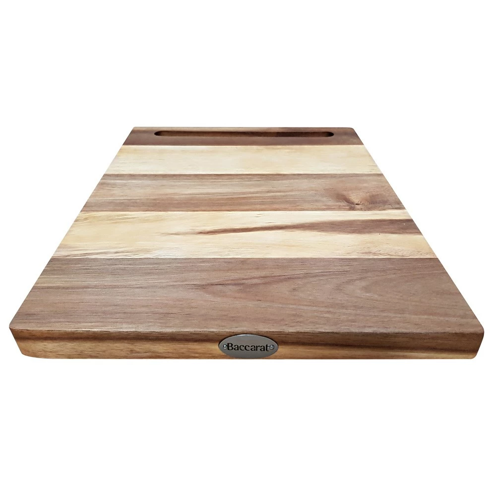 Slice and dice your veggies with ease using the strong and durable Baccarat Butchers Corner Acacia Rectangle Chopping Board 43cm. Acacia wood is a prized timber for its strength and beauty. It is genuine hard wood, rich with natural oils that give it a natural water resistance as well as prolonging the sharpness of your knives. It is equally suited as an elegant serving board as Acacia is beautiful as well as strong and robust. The Baccarat Butchers Corner Acacia Rectangle Chopping Board 43cm is easy to clean, we recommend you hand wash the board.
