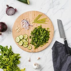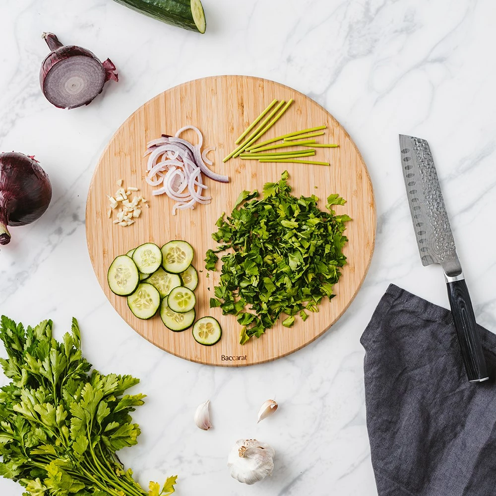 Combined convenience and style with the Baccarat Dishwasher Safe Bamboo Round Cutting Board 30cm.