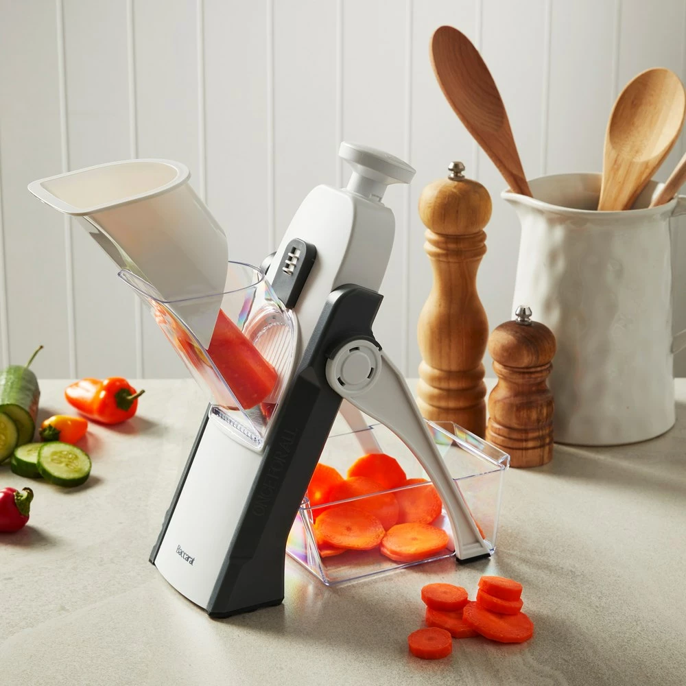Chop your favourite fresh ingredients with enhanced precision and ease using the innovative Baccarat Prepare Stand Up Mandoline! Ideal for preparing all kinds of vegetables for salads, soups and stirfrys, the Prepare Stand Up Mandoline is a must-have for any avid home cook. Slice, dice and julienne anything from sweet potato to zucchini and achieve your desired thickness between 0.5mm to 8mm with the multi-blade settings. Exceptionally easy to use, the Prepare Stand Up Mandoline offers simple action slicing to help you cut down on food preparation time. Equipped with suction feet, this slicer is designed to stay firmly in place while in use for optimum safety and stability. It has a folding stand for space-saving storage and comes equipped with a clear container that sits in position to receive the cut ingredients minus any mess! Enjoy the ultimate meal preparation experience with the Baccarat Prepare Stand Up Mandoline.
