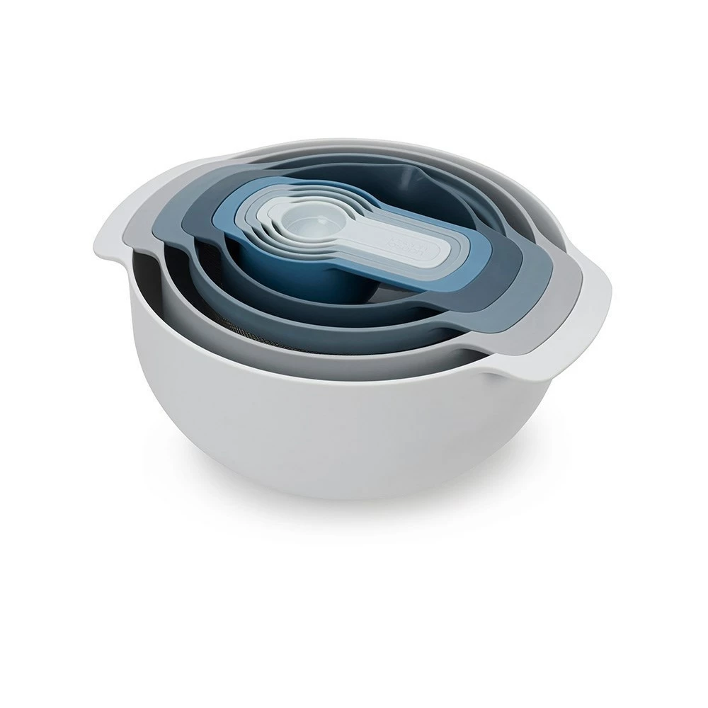 The Joseph Joseph Editions Nest Plus 9 Piece Food Preparation Set is the ultimate solution to a cluttered kitchen. Featuring 9 of the most common kitchenware items to cover all your food prep needs, the Joseph Joseph Editions Nest Plus 9 Piece Food Preparation Set includes 5 x measuring cups, 2 x mixing bowls, 1 x colander, and 1 x sieve, all of which can be stacked and snapped securely together for practical, space-saving storage. Whether using separately or all at once, the Joseph Joseph Editions Nest Plus 9 Piece Food Preparation Set is an essential for any home cook. Featuring an on-trend dusty blue and soothing grey colourway, all parts of the Joseph Joseph Editions Nest Plus 9 Piece Set is dishwasher safe for easy cleaning.