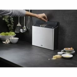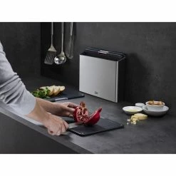 Elevate your at home culinary experience with the Joseph Joseph Folio Steel 4 Piece Chopping Board Set Stainless Steel. Comprising of a silver coloured slimline case and four chopping boards, the set will look fantastic placed on the countertop of a host of different style kitchens. With four colour coded chopping boards to help avoid cross contamination, each board benefits from a double sided textured cutting surfaces and non-slip feet for safe chopping, slicing and dicing. The innovative case from the Joseph Joseph Folio Steel 4 Piece Chopping Board Set Stainless Steel holds the boards separate so the air can circulate around them to avoid bacteria growth. The case also benefits from a fingerprint proof stainless steel outer that is effortless to keep clean. The Joseph Joseph Folio Steel 4 Piece Chopping Board Set Stainless Steel is also available in sleek rose gold and carbon black colours to complement your kitchen.