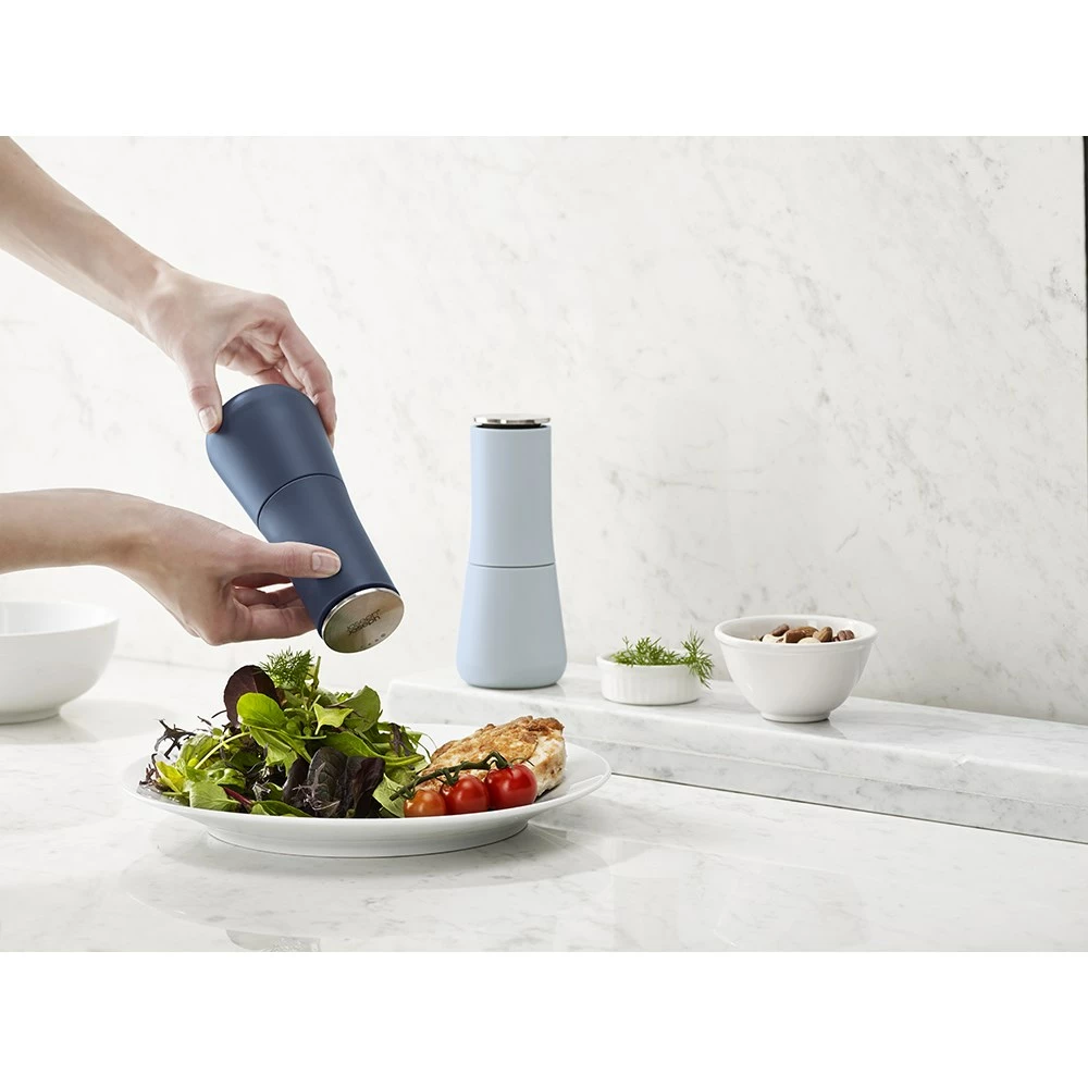 The Joseph Joseph Milltop Salt & Pepper Set will look fantastic placed on your table at meal times. Working in the opposite way to convenientinal salt and pepper mills that leave messy, excess grounds wherever they’re placed, the Joseph Joseph Milltop Salt & Pepper Set has the grinding mechanism at the top of the mill. This innovated, inverted design keeps the table top free from mess as the excess grinds simply fall back inside the mills after use. With a durable ceramic grinding mechanism, the Joseph Joseph Milltop Salt & Pepper Set produces effortless, perfectly ground salt and pepper for you to enhance your meals with. Coming in stunning blue tones that have be inspired by nature, each mill can be refilled from its base with ease.