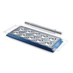 Make an easy job of preparing authentic homemade Ravioli with the Marcato Ravioli Tablet with Rolling Pin Blue. With all the components to allow you to make fresh, delicious ravioli in just minutes, the Marcato Ravioli Tablet with Rolling Pin Blue is an essential accessory for pasta lovers and those who appreciate fine Italian cuisine. With the capacity to make ten pieces at once, the tablet is built from strong, resilient anodised aluminium to offer maximum stability during use. Also included are a removable cutting surface made from food-grade polycarbonate to create beautifully neat cuts and a bonus aluminium rolling pin. Simply choose your favourite filling and you’re ready to get started! Wipe the Marcato Ravioli Tablet with Rolling Pin Blue after use with a soft sponge and warm water and clean the residue with a toothpick or small brush.