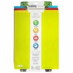 Chop and prepare with ease using the Scullery Essentials Flexible Colour Coded Cutting Mat Set of 4. This set of 4 is specially colour codes, this will help avoid cross food contamination by assigning vegetables, poultry, red meat and seafood to a different colour. The polyethylene cutting surface won’t dull knives and it is also odour resistant. The mats are very flexible so you can flex the mat to pour into a bowl or pan for convenience.