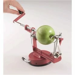 The Scullery Essentials Red Apple Peeler will peel, slice and core apples easily.