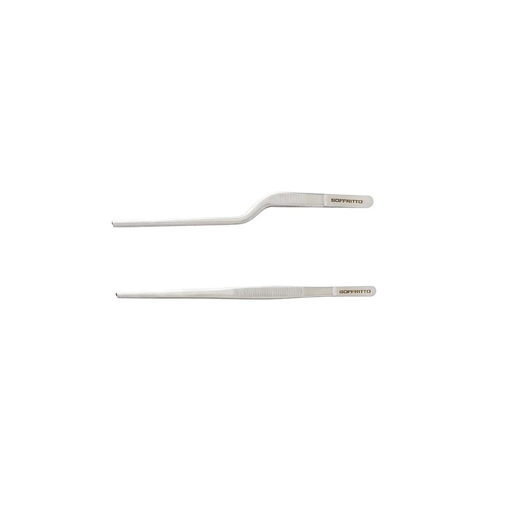 Both functional and practical, the Soffritto A Series Plating Tongs Set of 2 assures ultimate performance in the kitchen. A great tool for enhancing the presentation of your dish, these tongs excel in layering finer ingredients like vegetable stems, herbs and other garnishes. This set includes a pair of fine tip precision tongs as well as offset precision tongs to rise to any plating challenge. Their high quality 18/10 stainless steel frames are built to last through the years, without compromising on feel. The Soffritto A Series Plating Tongs Set of 2 are a part of the Soffritto A Series range, meaning they are designed and engineered to the highest professional standards. With their modern and sophisticated black trim, each product in the A Series range is designed to emulate the precision tools of professional chefs, no matter where and when you cook.